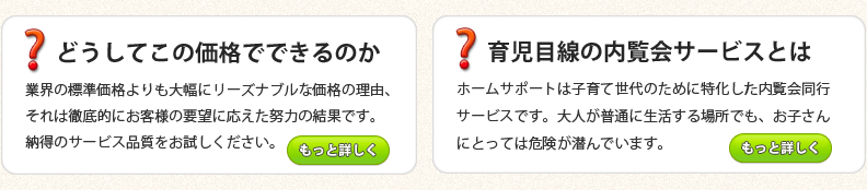 マンション内覧会立会い同行専門。分野を特化、条件を絞り、口コミ一番の安心価格29,800円を実現。すべてはお客様とお子さんの安全な暮らしのため。ホームサポートは子育て世代のくらしを応援します。その理由内覧会の詳細7つの理由